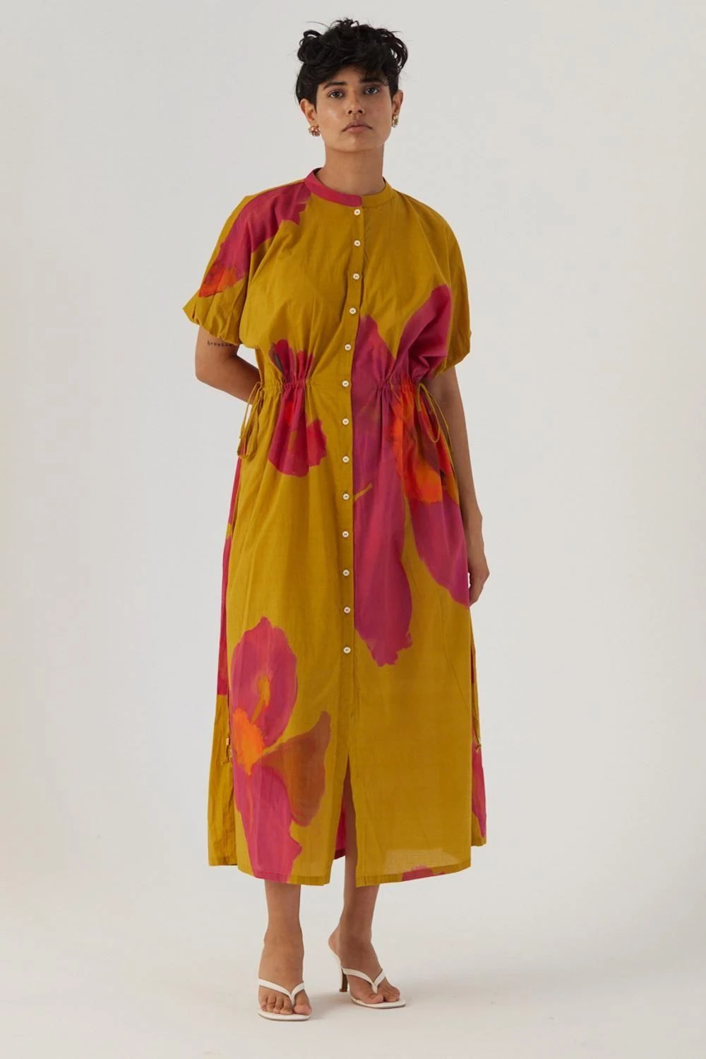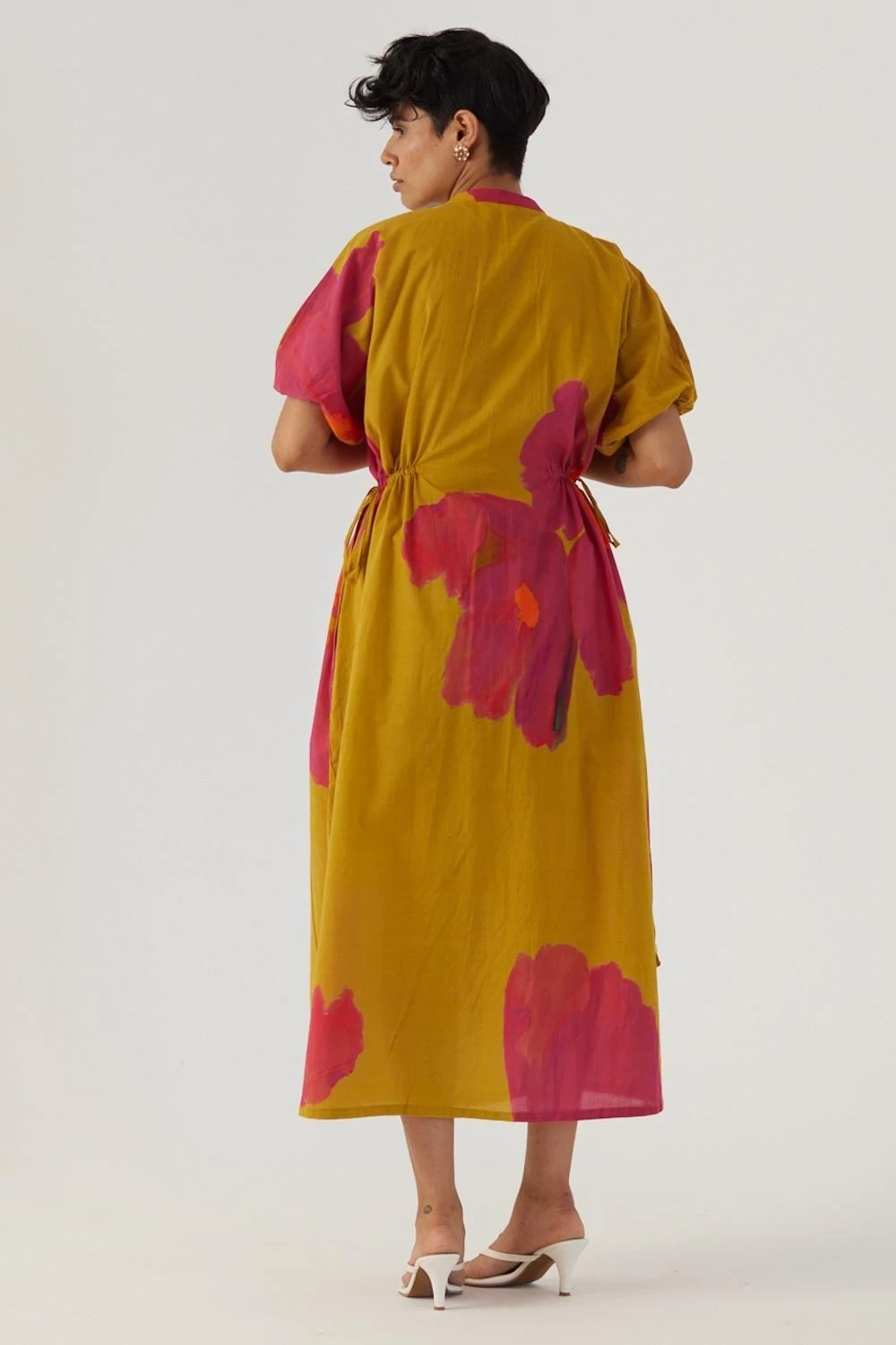 Indulge in the captivating elegance of this dress, where a blend of mustard & pink hues dances with hand-painted leaves. With a tie-up string at the side waist, it allows you to customize the fit to your desired waistline.